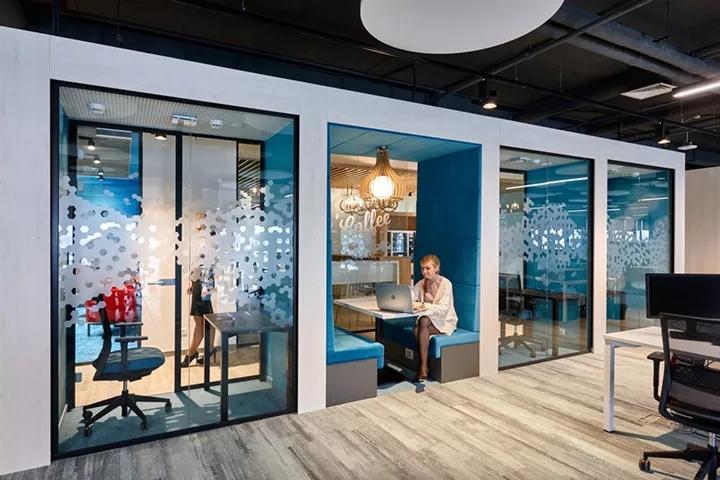 開放空間主要采用開放式框架系統(tǒng)來界定空間區(qū)域,這樣可以營造開闊的空間感;某些區(qū)域,這些分隔系統(tǒng)還兼作臨時(shí)頭腦風(fēng)暴會議的白板功能。深圳裝修公司為了營造一個(gè)良好的工作氛圍,在工作區(qū)引入了吸音板吊頂系統(tǒng),降低空間噪音。