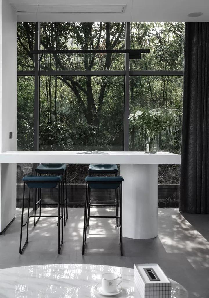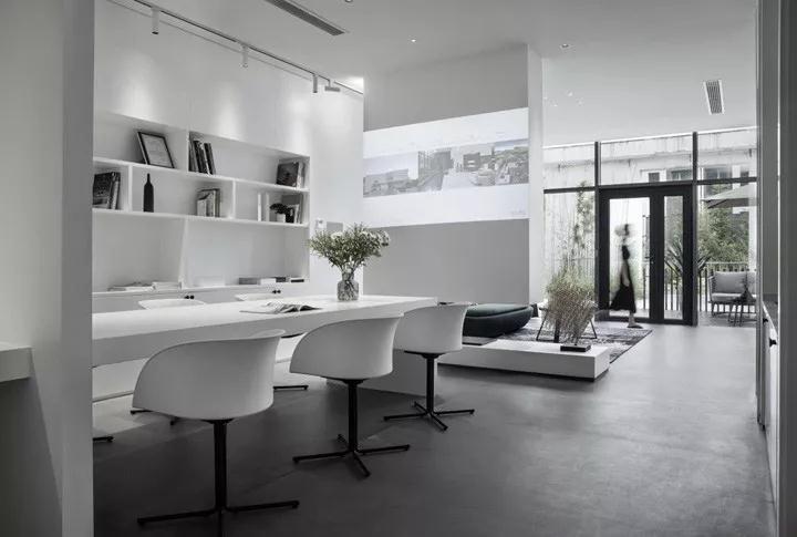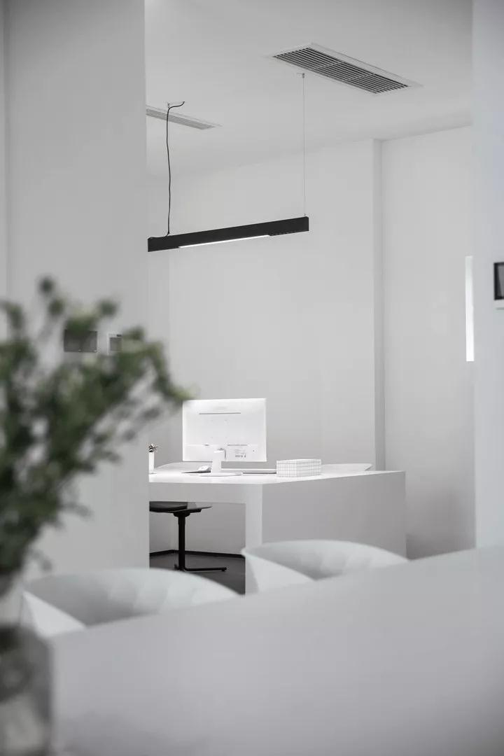 在色彩上,回歸對“無”的一種思考。設(shè)計需要一種克制的色彩,而且充滿張力和想象力。在豐富多彩的世界里,白色最接近內(nèi)心,最為尊貴,也許是最絢麗多彩的顏色。設(shè)計師選擇了白色,白色的天花,白色的墻面,白色的家具,少許低飽和度的綠色統(tǒng)一在灰色水泥地面中,形成對比,促進(jìn)著情緒和情感的激發(fā)。