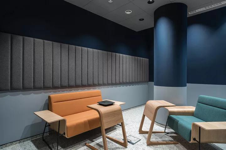對于設計團隊來說,房間聲學設計至關重要。墻面上、照明上、工作臺之間的聲學板或其它聲學系統可以有效控制工作場所的噪音。本案還有一個很有趣的元素就是辦公和會休閑議之間的木柱隔斷,其中一部分圓柱覆蓋以特殊的吸音面料。同時面料的色彩與近旁的座椅相同,形成呼應。