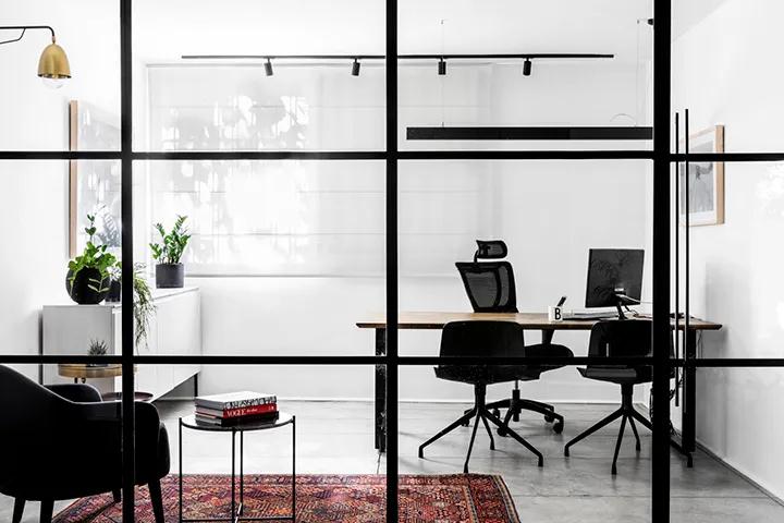 內部采用極細的黑色金屬框架玻璃作為新的隔斷墻,與大面積的白墻形成鮮明而有趣的對比。辦公區設計和休閑區使用天然水泥地板,會議室由魚骨木地板制成。定制鋼架辦公家具和精心挑選的家庭休閑家具設計交織在一起,營造出統一的環境氛圍。